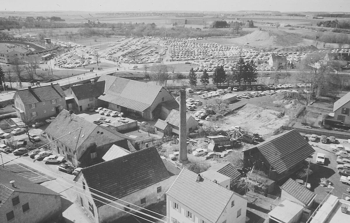 Am 24. September 1972 fand das Mannschaft-WM-Finale der Speedwayfahrer statt, das 18.000 Besucher von Nah und Fern nach Olching lockte. Zur Erinnerung: die Gemeinde hatte damals gerade einmal 10.000 Einwohner. Damals wie heute wurde der Volksfestplatz zum Parkplatz umfunktioniert. Wie das Foto belegt, mussten die Besucher sich weitere freie Plätz in der Umgebung der Sportarena suchen. So waren die Nöscher- und Pfanzeltstraße rund um die ehemalige Kartoffelschnapsbrennerei mit ihrem markanten Backsteinkamin mit Autos blockiert. Das landwirtschaftliche Anwesen von Anton Neumeier konnte mit dessen Einwilligung inklusive der Wiesen hinter den Gebäuden bis zum Mühlbach zugeparkt werden. Der Rodelberg, respektive Schuttberg, rechts oben im Bild befand sich noch in der Entstehungsphase, darüber ist das 1969 erweiterte Schulgebäude von Neu-Esting zu erkennen.